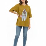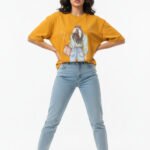 The t-shirt features a minimal yet artistic front print, adding a soft aesthetic touch without overpowering the look. The warm mustard tone enhances versatility, making it easy to pair with jeans, cargo pants, skirts, or shorts.